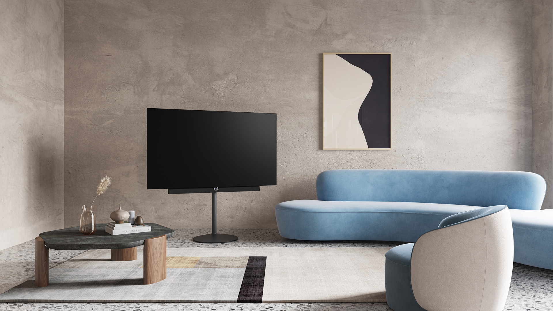 Ebenfalls neu ist die Systemfarbe Basaltgrau, in der sich der drehbare Tischfuß präsentiert. Die elegante Farbgebung strahlt Ruhe und Gelassenheit aus und bietet sich als Ergänzung zu vielen Farbkonzepten an. So harmoniert der Loewe bild 5 in jedem anspruchsvoll gestalteten Wohnambiente. Dabei sorgen das integrierte Kabelmanagement und die aufgeräumt gestaltete Rückwand dafür, dass sich der Loewe bild 5 sehr flexibel positionieren und auch frei im Raum platzieren lässt.